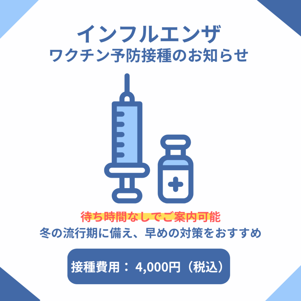 当院では、今年は例年より早く 9月19日よりインフルエンザワクチン接種 を開始いたします。 接種概要 📍 アクセス:新宿駅南口より徒歩3分 ⏰ 診療時間:夜22時まで ⏳ 待ち時間なしでご案内可能 💉 接種費用:1回 4 […]