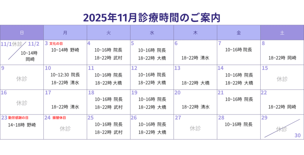 2025年11月は、診療体制の一部調整に伴い、下記の通り一部診療時間の変更を予定しております。正式な診療時間は確定次第、改めてご案内いたします。 🔹2025年11月中の診療時間 月曜日:10:00-12:30 / 18: […]