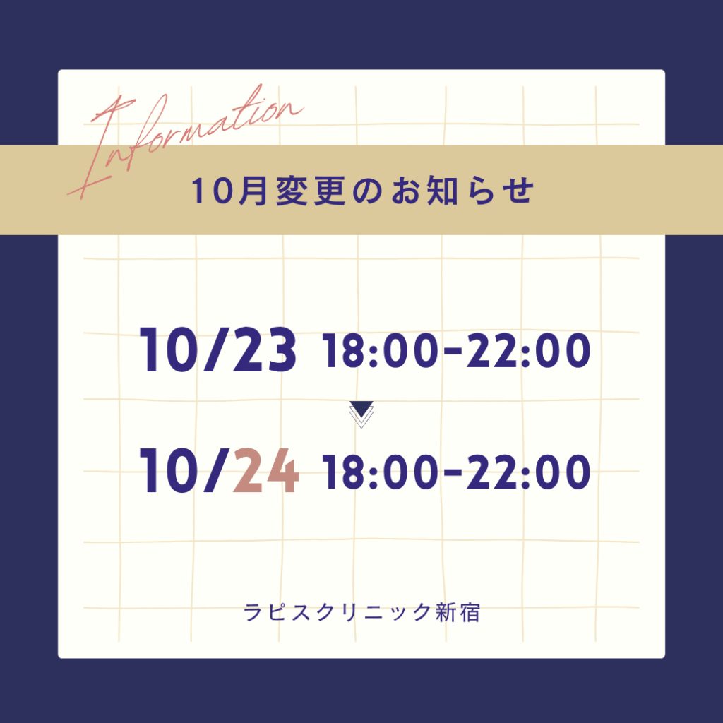 いつもラピスクリニック新宿をご利用いただきありがとうございます。 医師の都合により、下記日程の診療時間を変更させていただきます。 🩵 変更前:10月23日(水)18:00〜22:00 🩵 変更前:10月24 […]