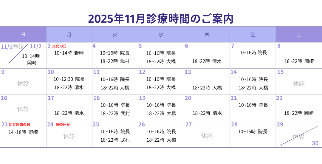 👇👇詳細は、下記「2025年11月 診療時間のご案内」をご覧ください。👇👇